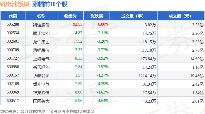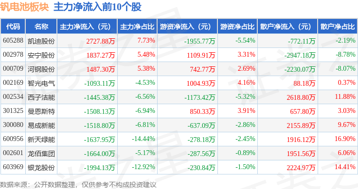 从资金流向上来看,当日钒电池板块主力资金净流出13.71亿元,游资资金净流出3261.09万元,散户资金净流入14.03亿元。钒电池板块个股资金流向见下表: