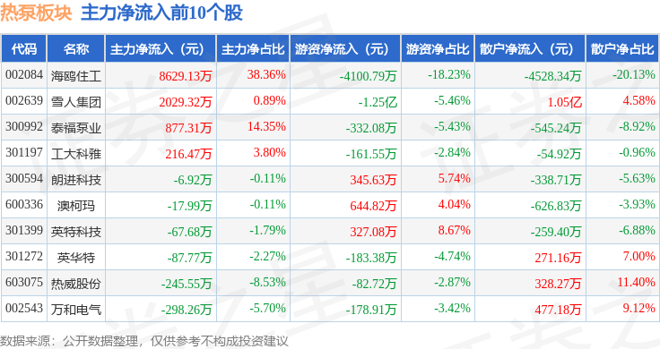 从资金流向上来看,当日热泵板块主力资金净流出5.49亿元,游资资金净流出7753.84万元,散户资金净流入6.26亿元。热泵板块个股资金流向见下表: