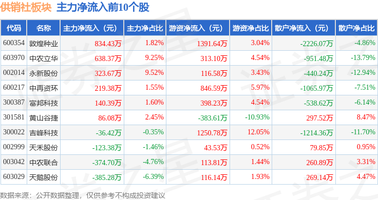 从资金流向上来看,当日供销社板块主力资金净流出2.68亿元,游资资金净流入4350.22万元,散户资金净流入2.25亿元。供销社板块个股资金流向见下表: