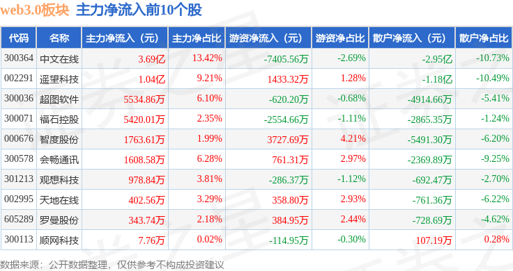 从资金流向上来看,当日web3.0板块主力资金净流出7.41亿元,游资资金净流入2.58亿元,散户资金净流入4.82亿元。web3.0板块个股资金流向见下表: