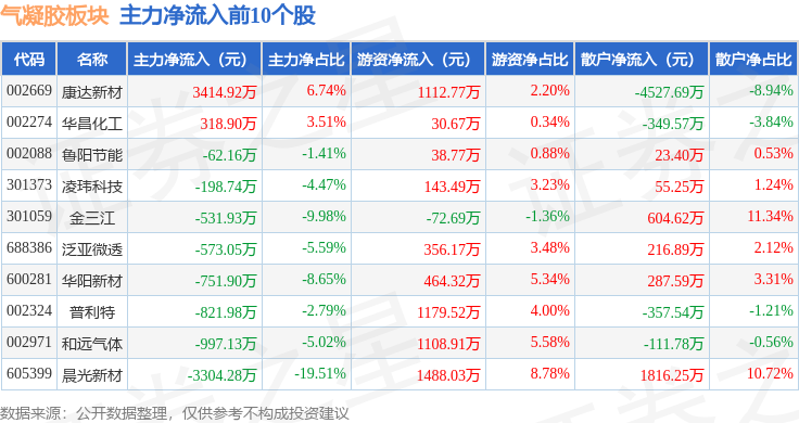 从资金流向上来看,当日气凝胶板块主力资金净流出6.39亿元,游资资金净流入8829.79万元,散户资金净流入5.5亿元。气凝胶板块个股资金流向见下表: