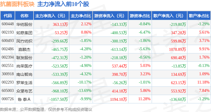从资金流向上来看,当日抗菌面料板块主力资金净流出4.42亿元,游资资金净流入1.38亿元,散户资金净流入3.05亿元。抗菌面料板块个股资金流向见下表: