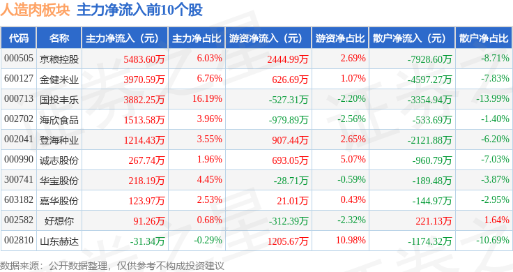 从资金流向上来看,当日人造肉板块主力资金净流出2.25亿元,游资资金净流入1.61亿元,散户资金净流入6426.68万元。人造肉板块个股资金流向见下表: