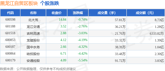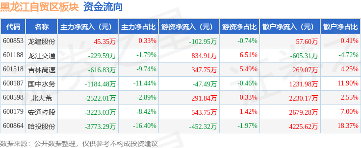 从资金流向上来看,当日黑龙江自贸区板块主力资金净流出1.15亿元,游资资金净流入1415.48万元,散户资金净流入1.01亿元。黑龙江自贸区板块个股资金流向见下表: