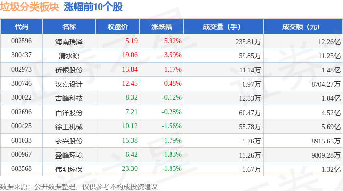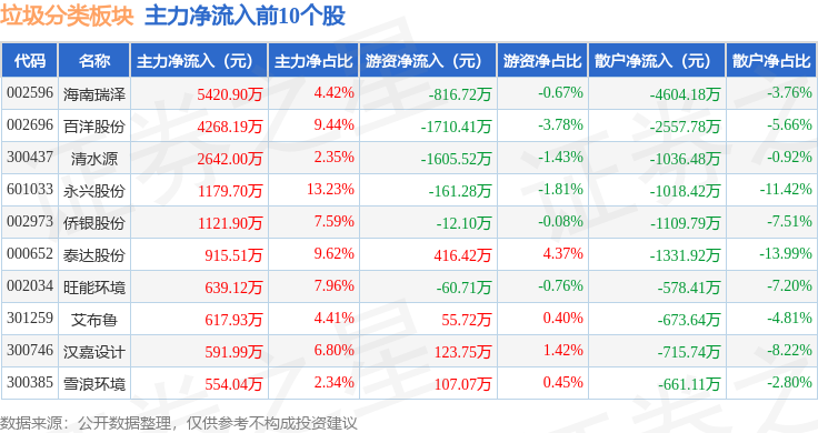 从资金流向上来看,当日垃圾分类板块主力资金净流出14.01亿元,游资资金净流入1.23亿元,散户资金净流入12.79亿元。垃圾分类板块个股资金流向见下表: