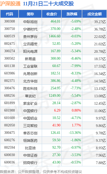 当日北向资金余额额度充足,特发信息(000070)领涨,涨幅10.0%,交易所公布的沪深股通二十大成交股中成交额前三的为中际旭创、宁德时代、贵州茅台,成交额分别为39.27亿元、36.78亿元、22.02亿元。详情可见下表: