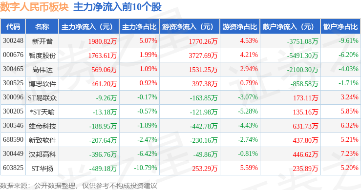 从资金流向上来看,当日数字人民币板块主力资金净流出42.08亿元,游资资金净流入3.49亿元,散户资金净流入38.59亿元。数字人民币板块个股资金流向见下表: