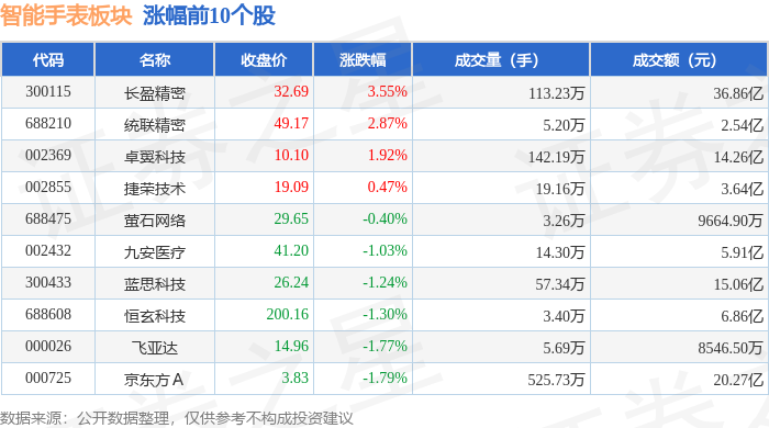 证券之星消息,11月21日智能手表板块较上一交易日下跌3.34%,北京君正领跌。当日上证指数报收于3834.89,下跌2.45%。深证成指报收于12538.07,下跌3.41%。智能手表板块个股涨跌见下表: