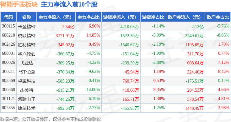 从资金流向上来看,当日智能手表板块主力资金净流出25.2亿元,游资资金净流入3.13亿元,散户资金净流入22.07亿元。智能手表板块个股资金流向见下表: