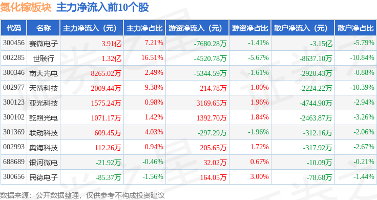 从资金流向上来看,当日氮化镓板块主力资金净流出60.98亿元,游资资金净流入11.36亿元,散户资金净流入49.62亿元。氮化镓板块个股资金流向见下表: