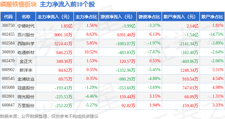 从资金流向上来看,当日磷酸铁锂板块主力资金净流出82.16亿元,游资资金净流入7.9亿元,散户资金净流入74.26亿元。磷酸铁锂板块个股资金流向见下表: