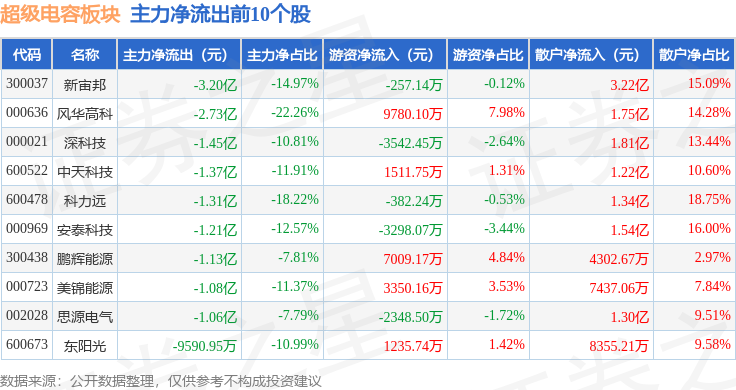 从资金流向上来看,当日超级电容板块主力资金净流出24.31亿元,游资资金净流入1.71亿元,散户资金净流入22.6亿元。超级电容板块个股资金流向见下表: