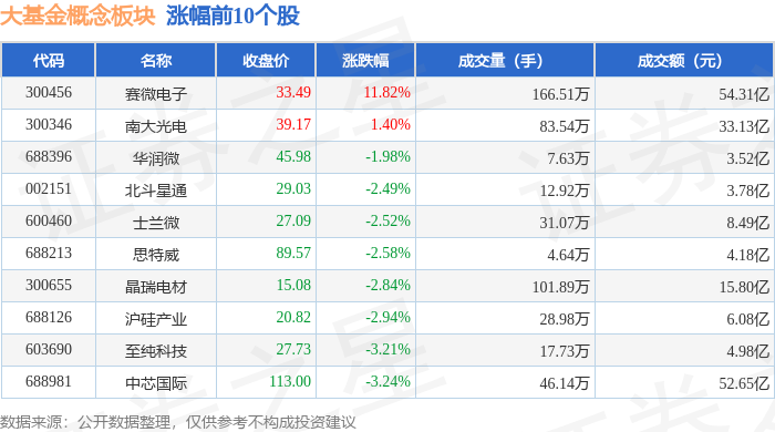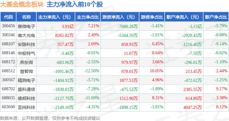 从资金流向上来看,当日大基金概念板块主力资金净流出52.61亿元,游资资金净流入13.75亿元,散户资金净流入38.86亿元。大基金概念板块个股资金流向见下表:
