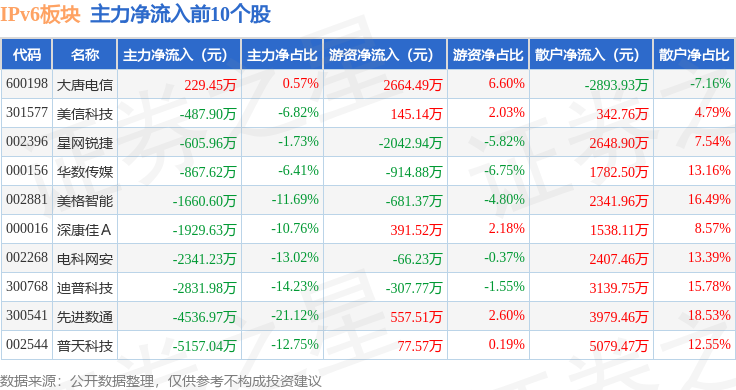 从资金流向上来看,当日IPv6板块主力资金净流出25.96亿元,游资资金净流入5.76亿元,散户资金净流入20.2亿元。IPv6板块个股资金流向见下表: