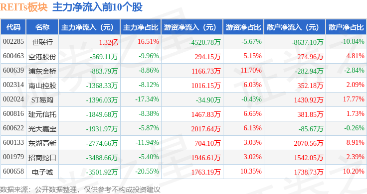 从资金流向上来看,当日REITs板块主力资金净流出5.22亿元,游资资金净流入1.07亿元,散户资金净流入4.14亿元。REITs板块个股资金流向见下表: