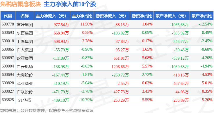 从资金流向上来看,当日免税店概念板块主力资金净流出14.28亿元,游资资金净流入2.61亿元,散户资金净流入11.66亿元。免税店概念板块个股资金流向见下表: