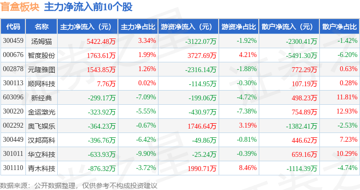从资金流向上来看,当日盲盒板块主力资金净流出1.79亿元,游资资金净流入5204.75万元,散户资金净流入1.27亿元。盲盒板块个股资金流向见下表: