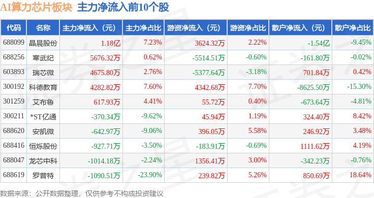 从资金流向上来看,当日AI算力芯片板块主力资金净流出13.86亿元,游资资金净流入5.66亿元,散户资金净流入8.2亿元。AI算力芯片板块个股资金流向见下表: