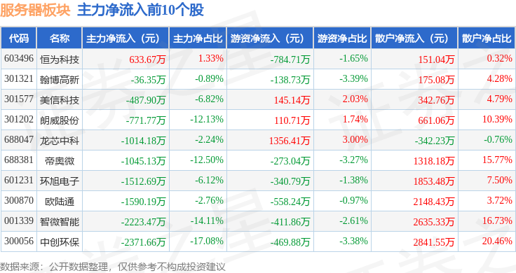 从资金流向上来看,当日服务器板块主力资金净流出76.98亿元,游资资金净流入12.63亿元,散户资金净流入64.36亿元。服务器板块个股资金流向见下表: