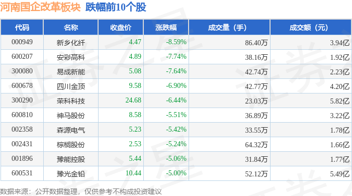 证券之星消息,11月21日河南国企改革板块较上一交易日下跌4.06%,新乡化纤领跌。当日上证指数报收于3834.89,下跌2.45%。深证成指报收于12538.07,下跌3.41%。河南国企改革板块个股涨跌见下表: