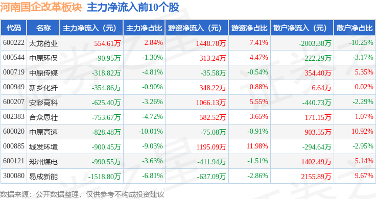 从资金流向上来看,当日河南国企改革板块主力资金净流出6.59亿元,游资资金净流入1.5亿元,散户资金净流入5.09亿元。河南国企改革板块个股资金流向见下表: