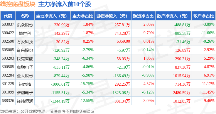 从资金流向上来看,当日线控底盘板块主力资金净流出3.8亿元,游资资金净流入8956.81万元,散户资金净流入2.91亿元。线控底盘板块个股资金流向见下表: