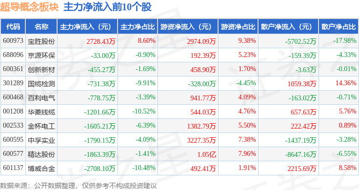 从资金流向上来看,当日超导概念板块主力资金净流出10.55亿元,游资资金净流入3.02亿元,散户资金净流入7.53亿元。超导概念板块个股资金流向见下表: