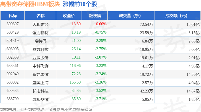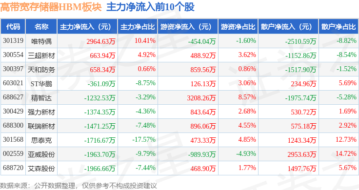 从资金流向上来看,当日高带宽存储器HBM板块主力资金净流出34.54亿元,游资资金净流入9.86亿元,散户资金净流入24.68亿元。高带宽存储器HBM板块个股资金流向见下表: