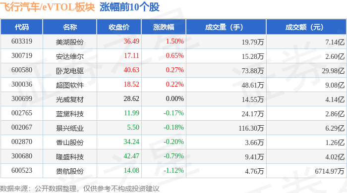 从资金流向上来看,当日飞行汽车/eVTOL板块主力资金净流出28.54亿元,游资资金净流入3.59亿元,散户资金净流入24.95亿元。飞行汽车/eVTOL板块个股资金流向见下表: