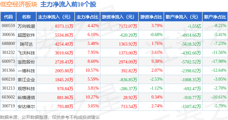 从资金流向上来看,当日低空经济板块主力资金净流出63.0亿元,游资资金净流入14.02亿元,散户资金净流入48.98亿元。低空经济板块个股资金流向见下表: