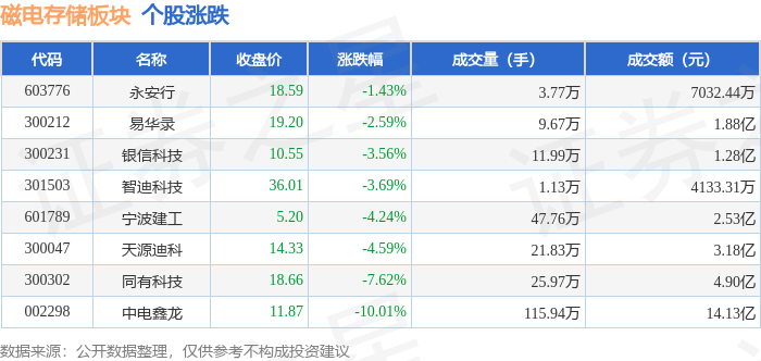从资金流向上来看,当日磁电存储板块主力资金净流出4.67亿元,游资资金净流出4533.47万元,散户资金净流入5.13亿元。磁电存储板块个股资金流向见下表:
