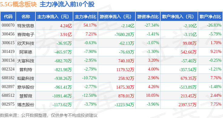 从资金流向上来看,当日5.5G概念板块主力资金净流出3.7亿元,游资资金净流出2823.9万元,散户资金净流入3.99亿元。5.5G概念板块个股资金流向见下表: