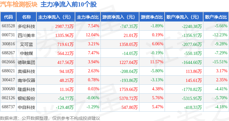 从资金流向上来看,当日汽车检测板块主力资金净流出3.37亿元,游资资金净流入1.46亿元,散户资金净流入1.9亿元。汽车检测板块个股资金流向见下表: