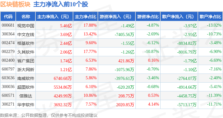 从资金流向上来看,当日区块链板块主力资金净流出89.72亿元,游资资金净流入15.04亿元,散户资金净流入74.69亿元。区块链板块个股资金流向见下表: