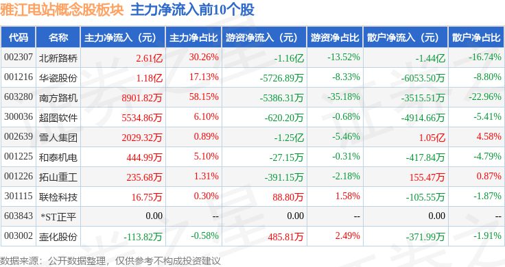 从资金流向上来看,当日雅江电站概念股板块主力资金净流出32.7亿元,游资资金净流出1.26亿元,散户资金净流入33.95亿元。雅江电站概念股板块个股资金流向见下表: