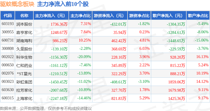 从资金流向上来看,当日驱蚊概念板块主力资金净流出4.06亿元,游资资金净流入9176.13万元,散户资金净流入3.14亿元。驱蚊概念板块个股资金流向见下表: