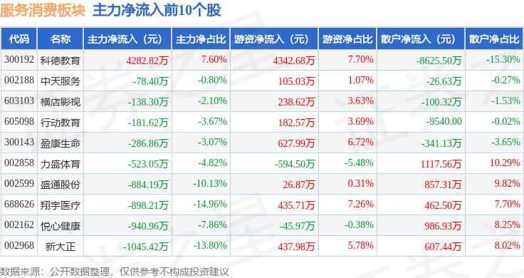 从资金流向上来看,当日服务消费板块主力资金净流出9.28亿元,游资资金净流入2.51亿元,散户资金净流入6.77亿元。服务消费板块个股资金流向见下表:
