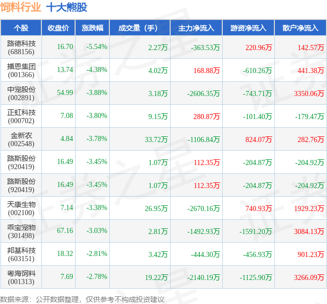个股表现方面,饲料行业当日领跌股为路德科技(688156),该股当日报收16.7,下跌5.54%,成交量2.27万,主力资金净流出363.53万元。播恩集团(001366)以下跌4.38%紧随其后,该股当日成交量4.02万,主力资金净流入168.88万元。除此之外,中宠股份(002891)、正虹科技(000702)、金新农(002548)均进入当日熊股之列。具体个股列表见下表: