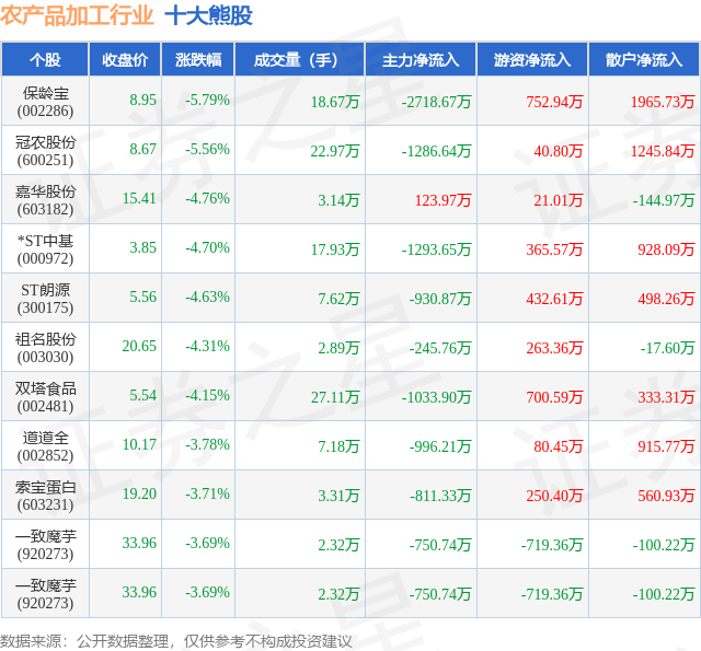 个股表现方面,农产品加工行业当日领跌股为保龄宝(002286),该股当日报收8.95,下跌5.79%,成交量18.67万,主力资金净流出2718.67万元。冠农股份(600251)以下跌5.56%紧随其后,该股当日成交量22.97万,主力资金净流出1286.64万元。除此之外,嘉华股份(603182)、*ST中基(000972)、ST朗源(300175)均进入当日熊股之列。具体个股列表见下表:
