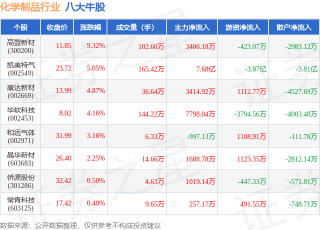 个股表现方面,化学制品行业当日领涨股为高盟新材(300200),该股当日报收11.85,上涨9.32%,成交量102.6万,主力资金净流入3406.18万元。凯美特气(002549)以上涨5.05%紧随其后,该股当日成交量165.42万,主力资金净流入7.68亿元。除此之外,康达新材(002669)、华软科技(002453)、和远气体(002971)均进入当日牛股之列。具体个股列表见下表: