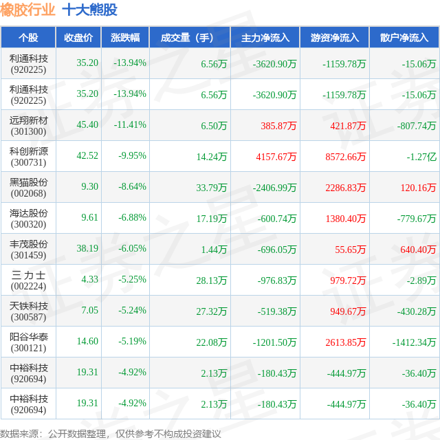 个股表现方面,橡胶行业当日领跌股为利通科技(920225),该股当日报收35.2,下跌13.94%,成交量6.56万,主力资金净流出3620.9万元。利通科技(920225)以下跌13.94%紧随其后,该股当日成交量6.56万,主力资金净流出3620.9万元。除此之外,远翔新材(301300)、科创新源(300731)、黑猫股份(002068)均进入当日熊股之列。具体个股列表见下表: