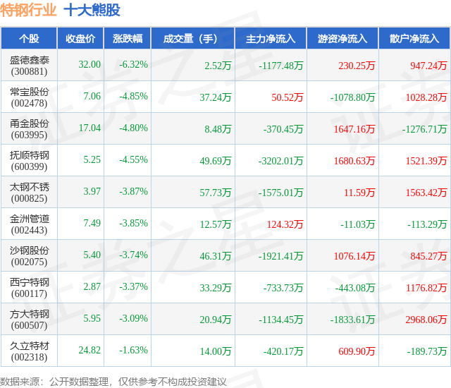 个股表现方面,特钢行业当日领跌股为盛德鑫泰(300881),该股当日报收32.0,下跌6.32%,成交量2.52万,主力资金净流出1177.48万元。常宝股份(002478)以下跌4.85%紧随其后,该股当日成交量37.24万,主力资金净流入50.52万元。除此之外,甬金股份(603995)、抚顺特钢(600399)、太钢不锈(000825)均进入当日熊股之列。具体个股列表见下表: