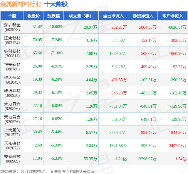 个股表现方面,金属新材料行业当日领跌股为深圳新星(603978),该股当日报收31.42,下跌10.0%,成交量28.97万,主力资金净流入962.21万元。江南新材(603124)以下跌7.24%紧随其后,该股当日成交量3.16万,主力资金净流出534.5万元。除此之外,铂科新材(300811)、悦安新材(688786)、福达合金(603045)均进入当日熊股之列。具体个股列表见下表: