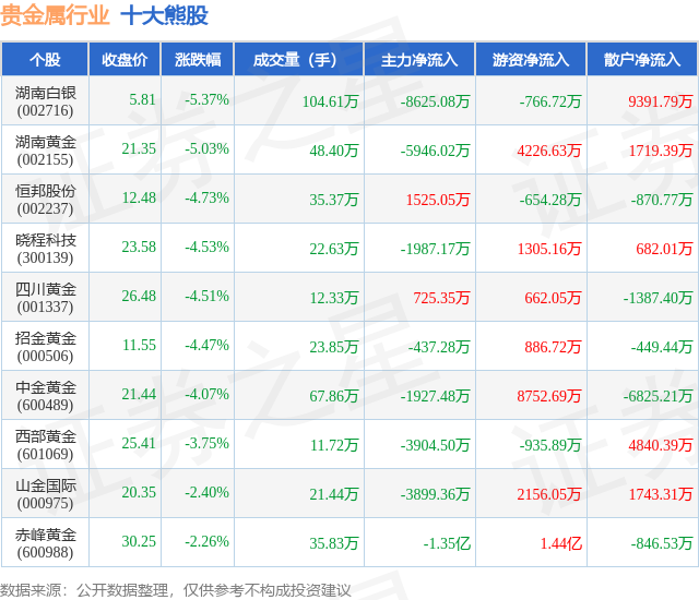 个股表现方面,贵金属行业当日领跌股为湖南白银(002716),该股当日报收5.81,下跌5.37%,成交量104.61万,主力资金净流出8625.08万元。湖南黄金(002155)以下跌5.03%紧随其后,该股当日成交量48.4万,主力资金净流出5946.02万元。除此之外,恒邦股份(002237)、晓程科技(300139)、四川黄金(001337)均进入当日熊股之列。具体个股列表见下表: