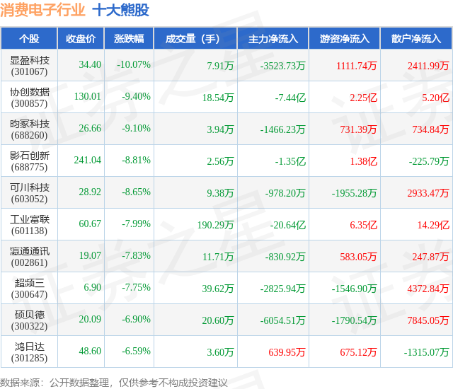 个股表现方面,消费电子行业当日领跌股为显盈科技(301067),该股当日报收34.4,下跌10.07%,成交量7.91万,主力资金净流出3523.73万元。协创数据(300857)以下跌9.4%紧随其后,该股当日成交量18.54万,主力资金净流出7.44亿元。除此之外,昀冢科技(688260)、影石创新(688775)、可川科技(603052)均进入当日熊股之列。具体个股列表见下表: