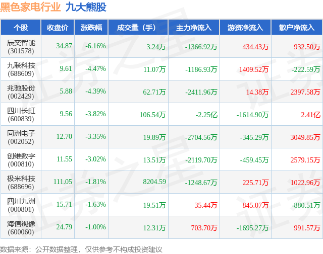 个股表现方面,黑色家电行业当日领跌股为辰奕智能(301578),该股当日报收34.87,下跌6.16%,成交量3.24万,主力资金净流出1366.92万元。九联科技(688609)以下跌4.47%紧随其后,该股当日成交量11.07万,主力资金净流出1186.93万元。除此之外,兆驰股份(002429)、四川长虹(600839)、同洲电子(002052)均进入当日熊股之列。具体个股列表见下表: