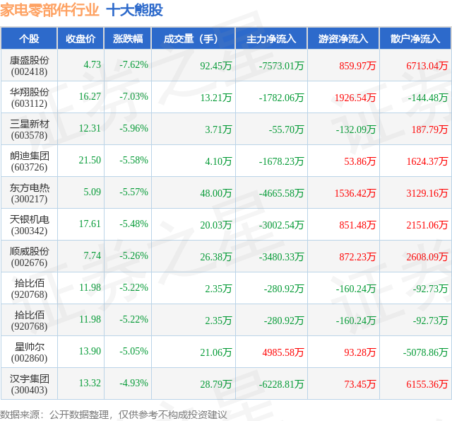 个股表现方面,家电零部件行业当日领跌股为康盛股份(002418),该股当日报收4.73,下跌7.62%,成交量92.45万,主力资金净流出7573.01万元。华翔股份(603112)以下跌7.03%紧随其后,该股当日成交量13.21万,主力资金净流出1782.06万元。除此之外,三星新材(603578)、朗迪集团(603726)、东方电热(300217)均进入当日熊股之列。具体个股列表见下表: