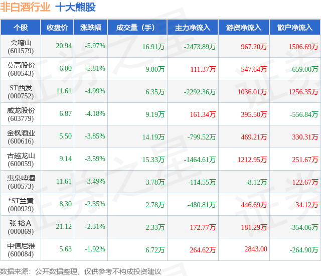 个股表现方面,非白酒行业当日领跌股为会稽山(601579),该股当日报收20.94,下跌5.97%,成交量16.91万,主力资金净流出2473.89万元。莫高股份(600543)以下跌5.81%紧随其后,该股当日成交量9.8万,主力资金净流入111.37万元。除此之外,ST西发(000752)、威龙股份(603779)、金枫酒业(600616)均进入当日熊股之列。具体个股列表见下表: