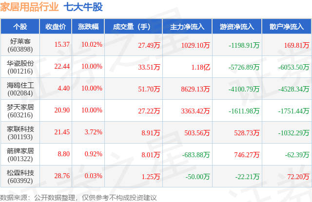 个股表现方面,家居用品行业当日领涨股为好莱客(603898),该股当日报收15.37,上涨10.02%,成交量27.49万,主力资金净流入1029.1万元。华瓷股份(001216)以上涨10.0%紧随其后,该股当日成交量33.51万,主力资金净流入1.18亿元。除此之外,海鸥住工(002084)、梦天家居(603216)、家联科技(301193)均进入当日牛股之列。具体个股列表见下表: