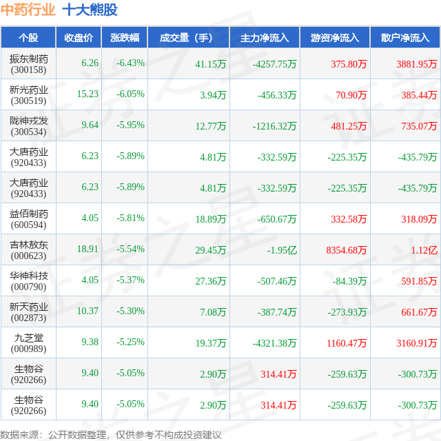 个股表现方面,中药行业当日领跌股为振东制药(300158),该股当日报收6.26,下跌6.43%,成交量41.15万,主力资金净流出4257.75万元。新光药业(300519)以下跌6.05%紧随其后,该股当日成交量3.94万,主力资金净流出456.33万元。除此之外,陇神戎发(300534)、大唐药业(920433)、大唐药业(920433)均进入当日熊股之列。具体个股列表见下表: